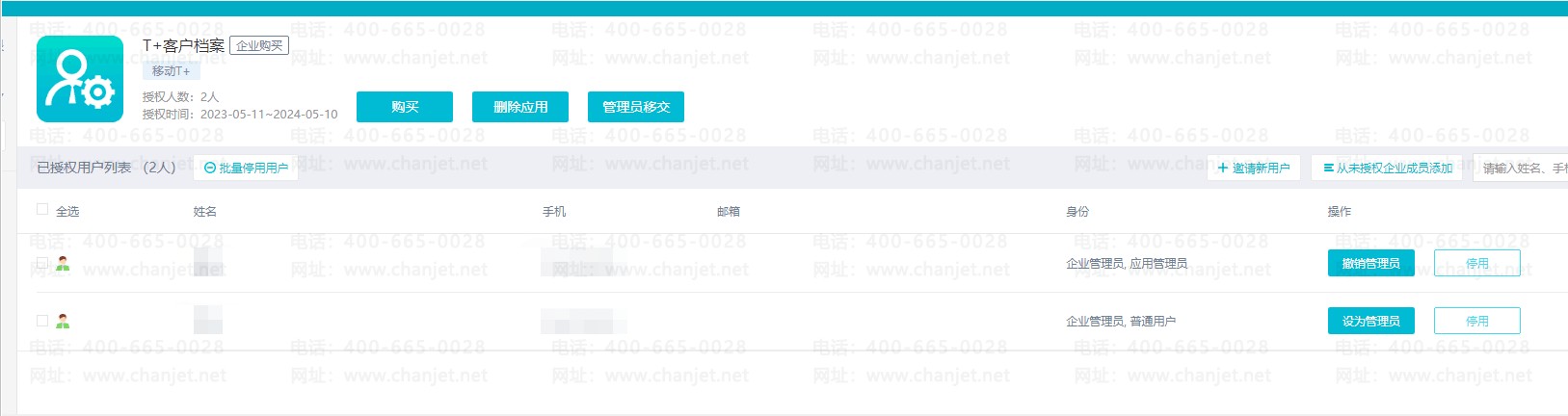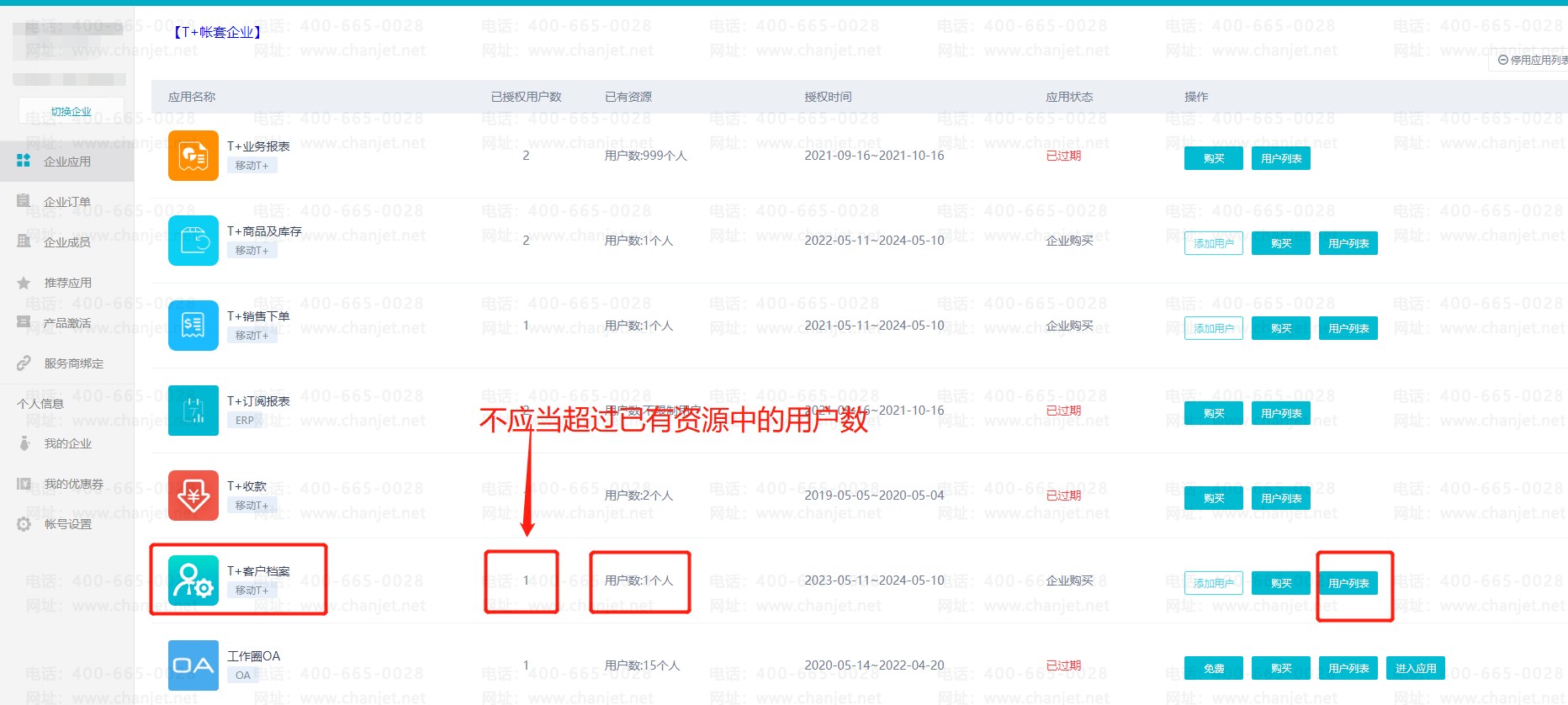 1. 用管理员手机号登录畅捷通官网,右上角切换至企业工作台;选择企业应用,找到对应的应用后检查已授权用户数是否超过已有资源用户数