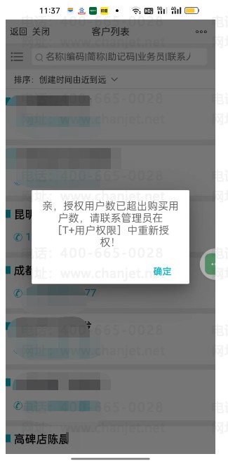 T+电脑端可以增加往来单位,但是手机端增加提示:授权用户数超出购买用户数