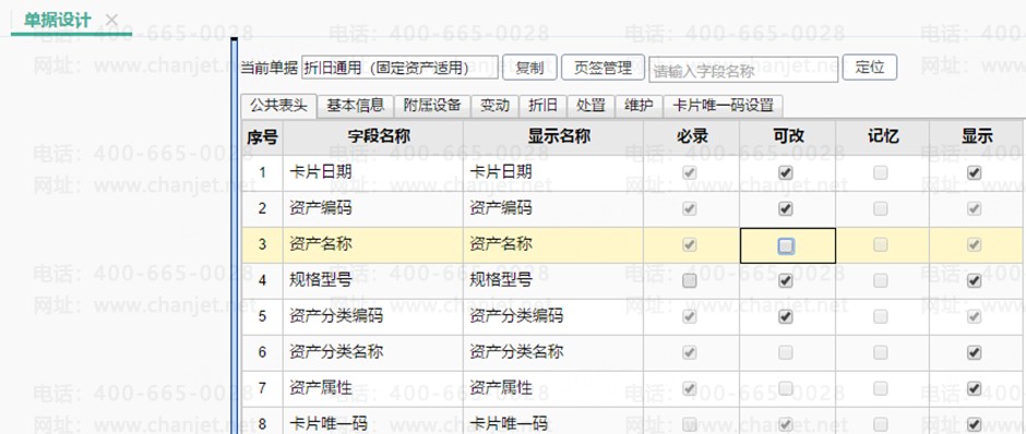 当【系统管理】-【单据设计】-【资产卡片】的资产名称字段没有勾选可改,那么也是不能修改的,需要把它勾选【可改】即可