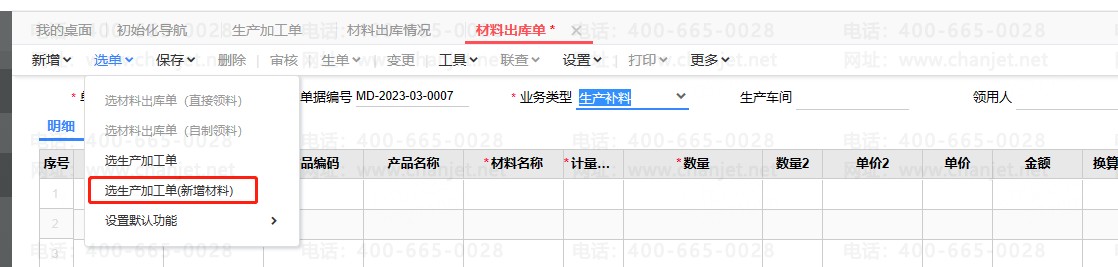 二.材料出库单,业务类型选择【生产补料】,选单选择【生产加工单(新增材料)】