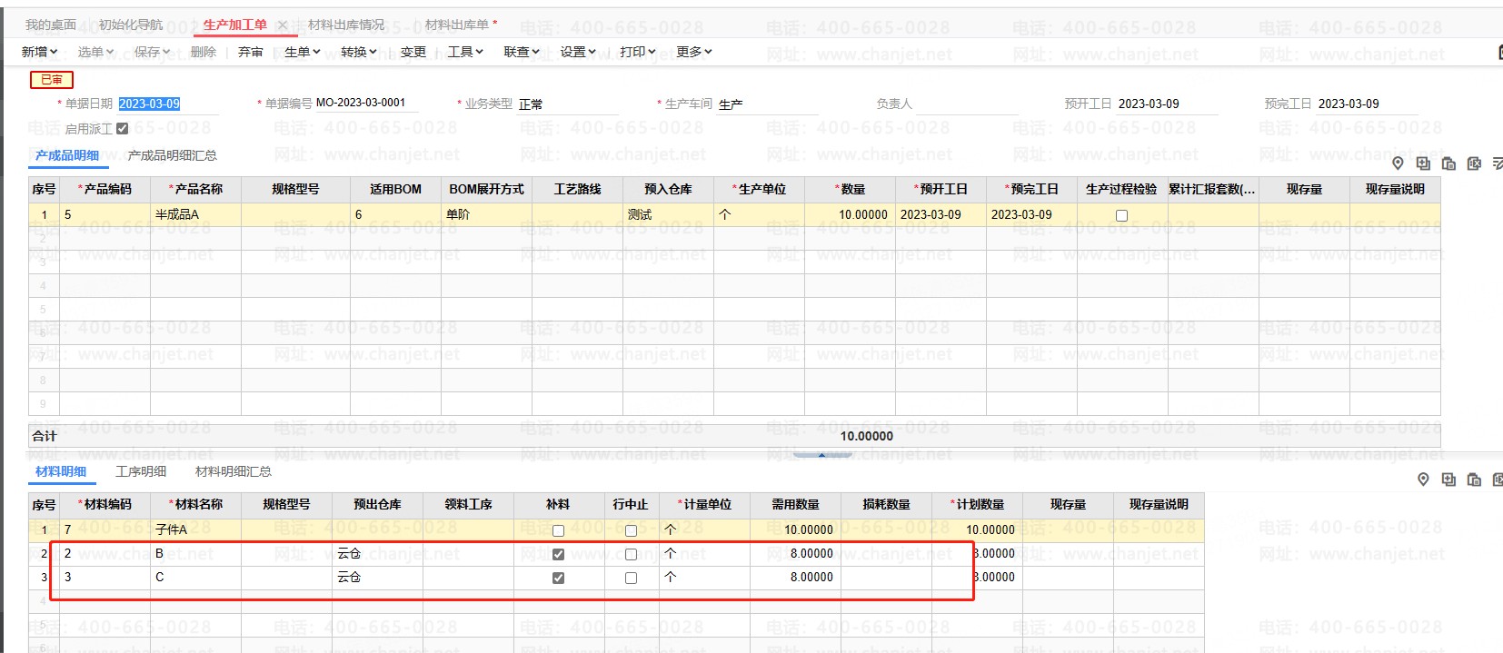 三.做完生产补料的材料出库单之后再去看生产加工单就可以看到新增的材料勾选了【补料】