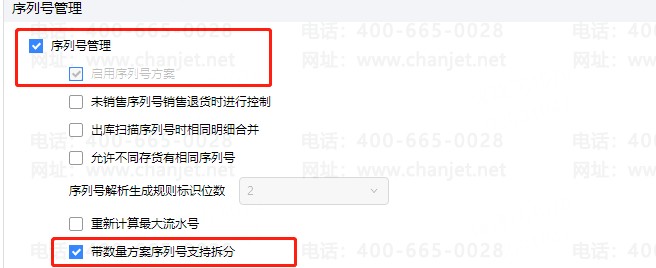 2、在【公共】页签中启用序列号管理并同时启用序列号方案和“带数量方案允许拆分”功能,启用后才有序列号拆分