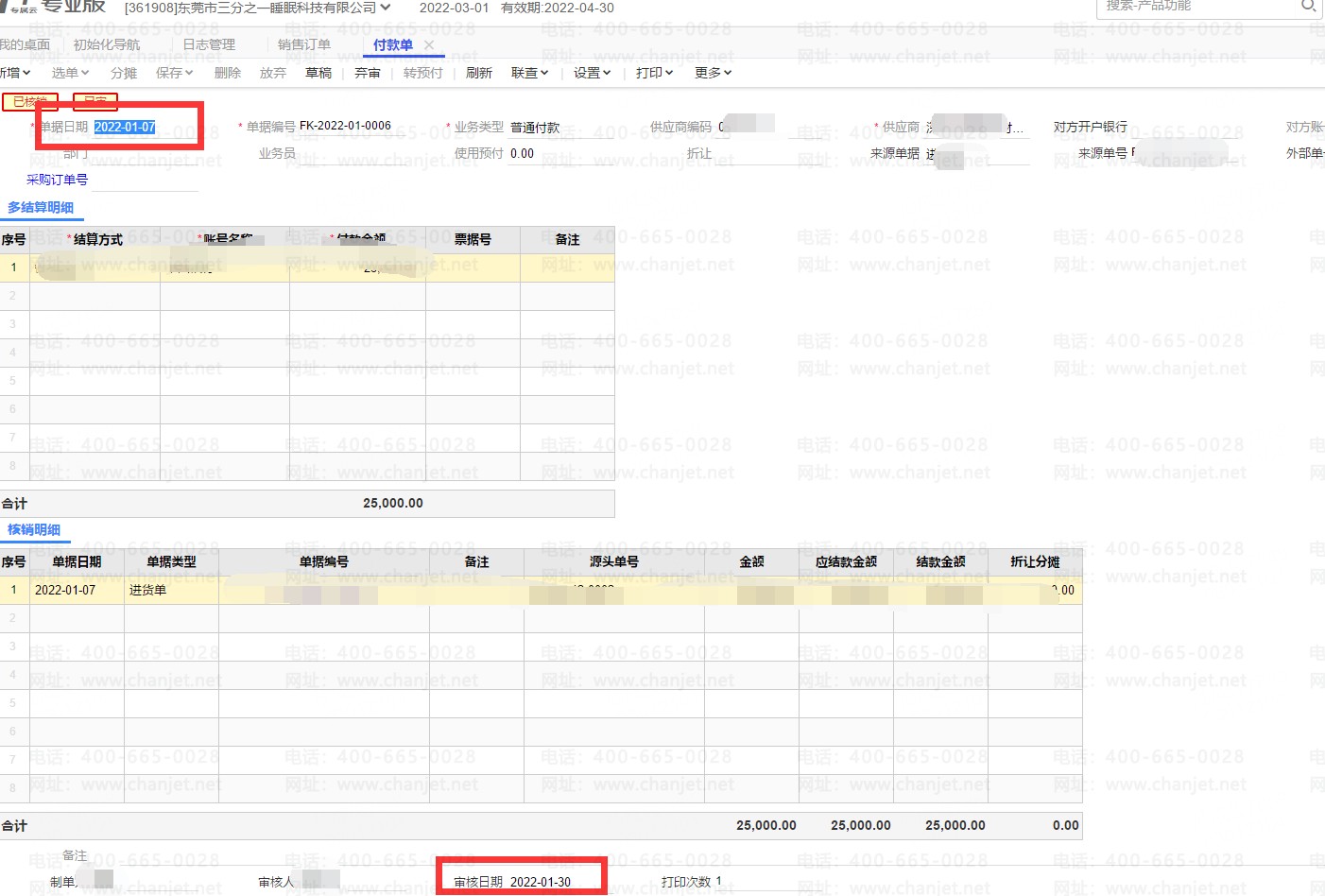 单据FK-2022-01-0006,单据日期为01月07日同样是02月25日审核的,审核日期为01月30日