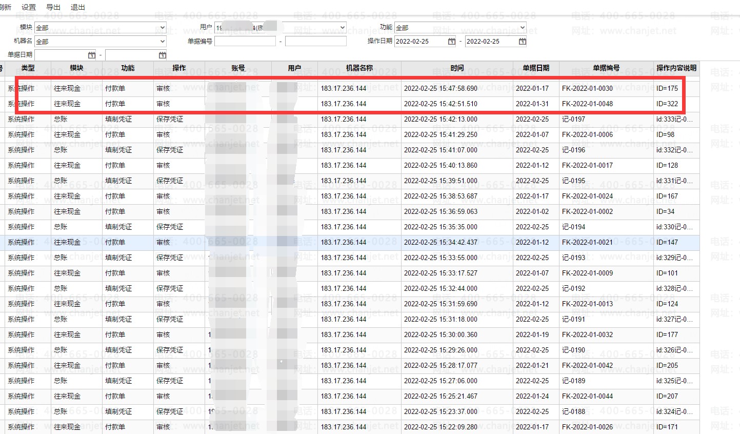 可通日志查询操作员2022-02-25相关单据审核情况如: