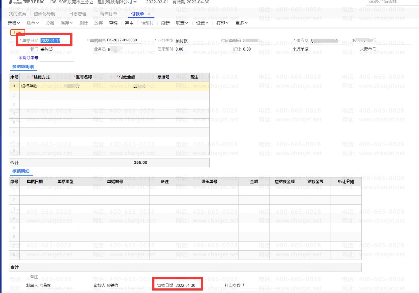 单据FK-2022-01-0030,单据日期为1月17日同样是02月25日审核的,审核日期为01月30日,