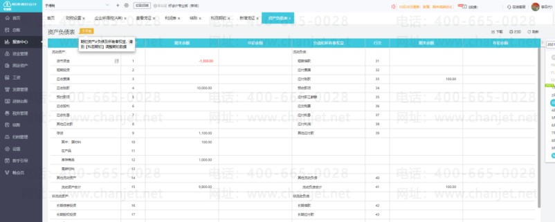 此时进入【报表】-【资产负债表】就发现报表是平衡的。资产负债表平衡之后才允许结账