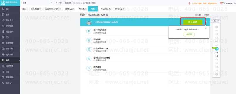 完成期末损益结转后,可以进入【结账】-【结账】界面,选中需要结账的月份,点击右上角【马上检查】,好会计会对结账期间做异常指标检查,如下图: