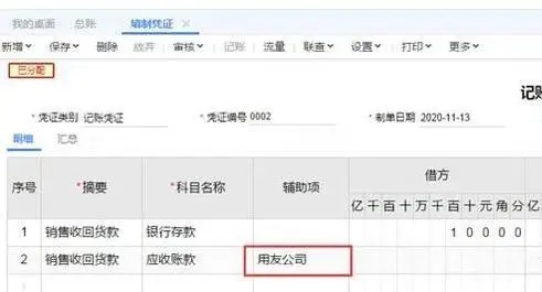 1、以用友T+为例,打开如图下凭证,辅助项为往来单位“用友公司”