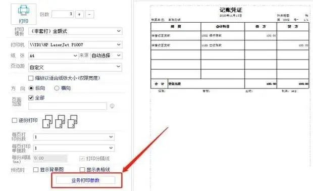 5、再来进行打印预览,发现还是没有辅助项信息,别急,还差最后一步,点击“业务打印参数”,把“按科目合并规则打印”的勾取消掉,如图下操作: