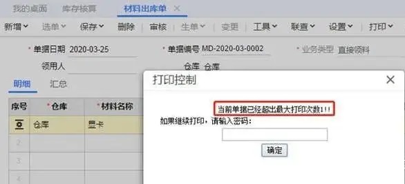 3、录入材料出库单并保存,点击打印即可。当我们需要进行二次打印时,系统就会跳出需要输入密码才可以继续打印,如图下: