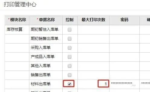 2、进入打印管理中心,找到材料领料单,把“控制”对应的框打上勾,设置打印次数为1,并设置好密码,如图下: