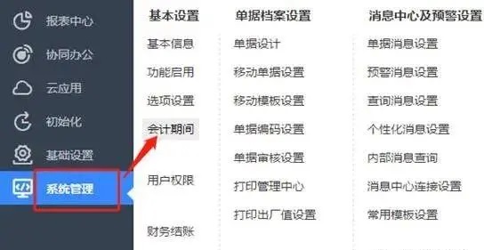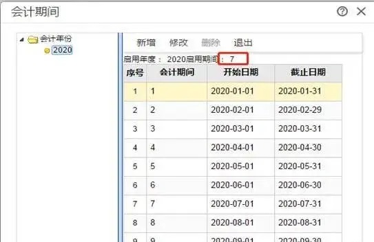 2、首先查询启用期间,也就是要反结账到启用期间,才可以修改期初,点击系统管理-会计期间,可以看到当前启用期间为2020年7月,也就是要反账到此月份才可以修改期初