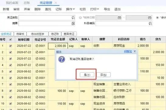 7、选中全部凭证,同时按下同时按“CTRL+ALT+H”,会跳出“取消记账,是否继续”,点是即可,如图