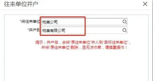 3、选择“将往来单位”对应的单位,同时选择“并户到”对应的单位,如图下把物美公司并户到物美有限公司