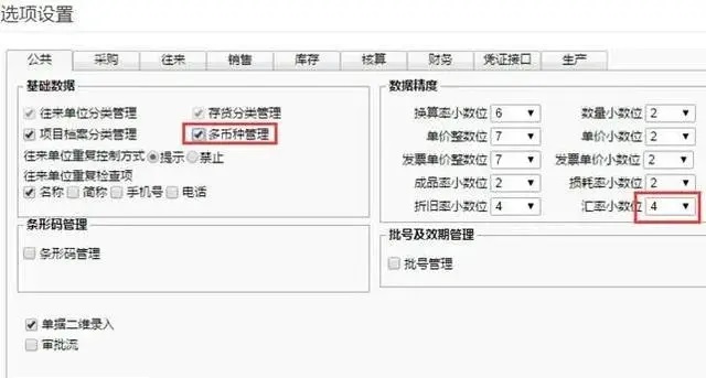 2、进入选项设置后,勾选“多币种管理”,并设置汇率小数位,如图下: