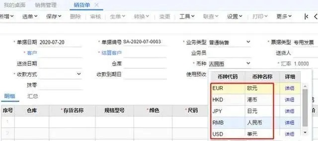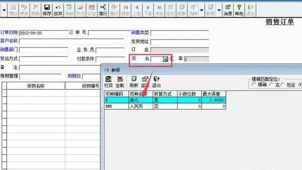 3、我们再来打开单据时,就可以看到启用后的币别了,如图下: