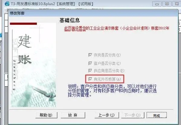 3、一直点下一步,直到出现基本信息对话框-“有无外币核算”,如图下操作: