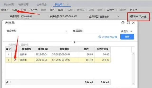 进入收款单界面,录入“结算客户”,选单,选择要收款的单据并点击确定,如图下: