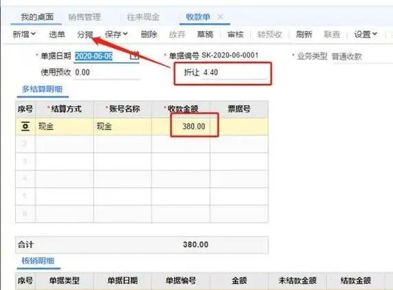 收款金额处录入整数380,折让掉的零头是4.4,再点击分摊,如图下: