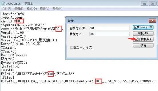 打开后,把当前对应的“001”账套号改成我们要生成的新的账套号,例如改成“002”,点击“编辑”-“替换”,有四处编号需要替换,点击全部替换并保存,如图下: