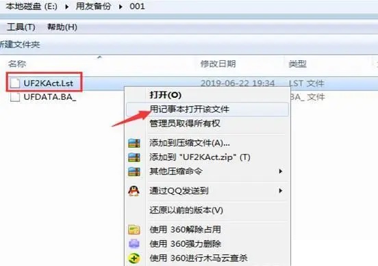 那么这两个文件的区别是什么呢?Lst是账套信息的日志文件,比如账套的编号与账套名称等,BA_是数据库文件,也就是数据都在这个文件里面。既然是恢复成一个新的账套,那就只需要更改Lst文件就可以了,数据文件不就能动的。选中Lst文件,鼠标右键,点击编辑,使用记事本格式打开,如图下: