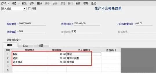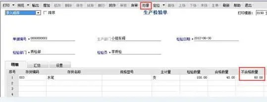 3.生产完成后,做生产检验单,生产质检后发现合格为40,不合格为60,