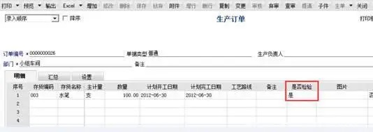 1、首先在T6下达生产订单,生产“水笔”100个,是否质检列选择“是”,如图下: