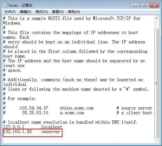 进入系统(以系统盘是C盘为例)C:\Windows\System32\drivers\etc ,该目录下有一个文件hosts,用记事本打开hosts文件,并在文件尾部新增一行记录,填写上服务器的IP地址和主机名,IP和计算机名空格使用tab键隔开。比如服务器的IP地址和主机名分别为192.168.1.88和CWSERVER,则配置如下: