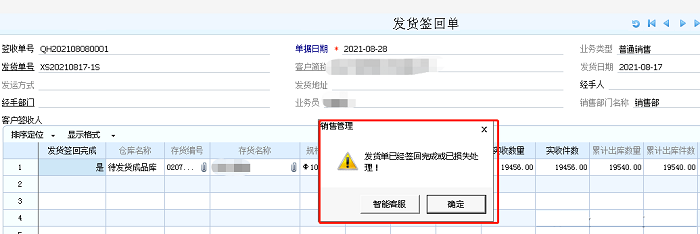 U8+删除发货签回单提示发货单已签回完成或以损失处理
