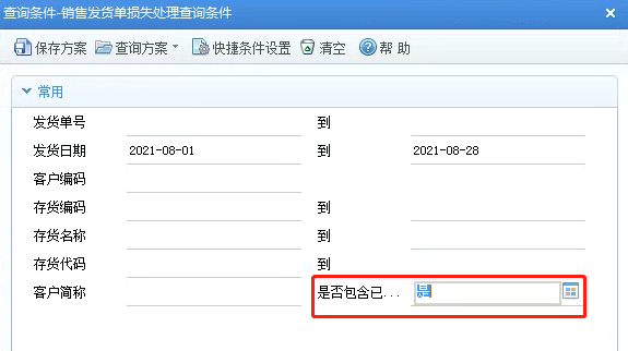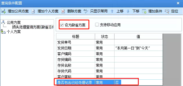 但是系统默认没有该条件,需要增加新的缺省方案,并将“是否包含已处理记录”改为常用条件。