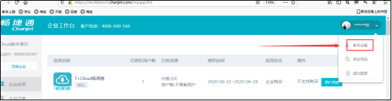用畅捷通账号登录官网www.chanjet.com,打开企业工作台-右上角-帐号设置