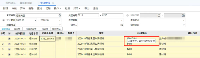 T+软件取消凭证记账时,提示“入库失败,至少输入2个字”