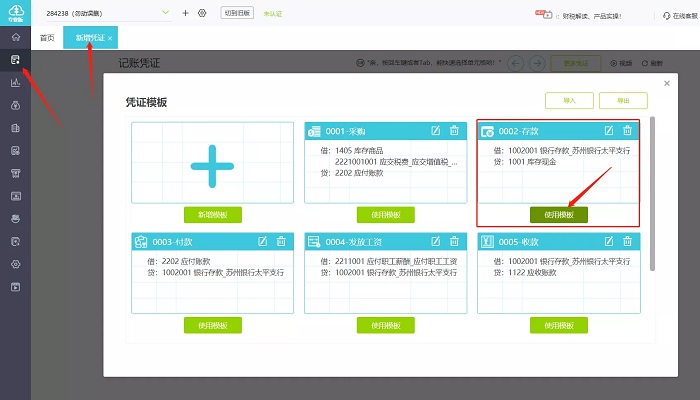 1.点击【总账】-【新增凭证】进入记账凭证页面,点击【模板】-【使用模板】或使用快捷键“F4”,调用已有的存款凭证模板。