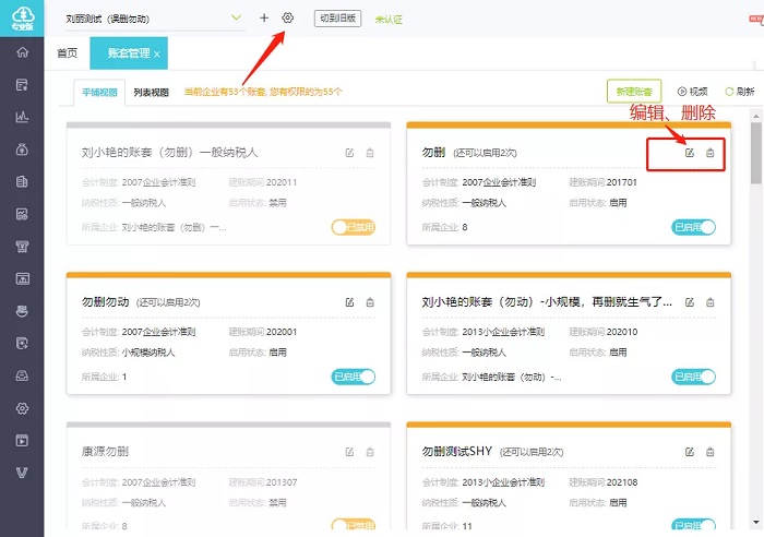 点击首页上方的“账套管理”按钮,可打开账套管理界面,对账套进行编辑、删除操作。