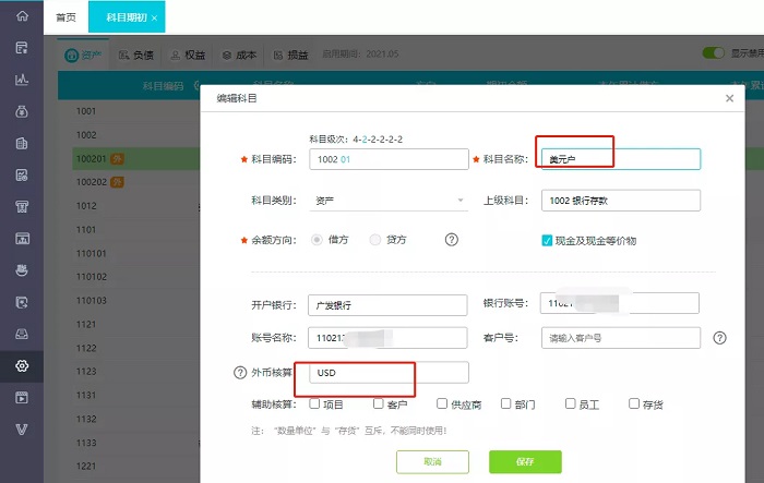 第一步:可以直接在好会计财务软件【设置】-【科目期初】-设置银行存款的二级科目(新开立的外币户)-勾选外币核算