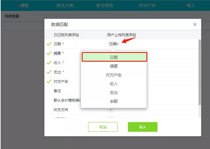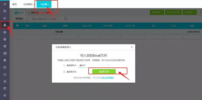 进入好会计云财务软件点击【资金管理】-【日记账】-【导入日记账】- -点击【选择文件】-选择对账单文件进行上传-进行匹配项目(因为每家银行对账单的格式不一样,表头有“交易日期”“交易备注”“对方户名”“收入”“支出”等各种信息,我们需要将这些信息和软件内部的匹配上,带红色星号为必须匹配)。