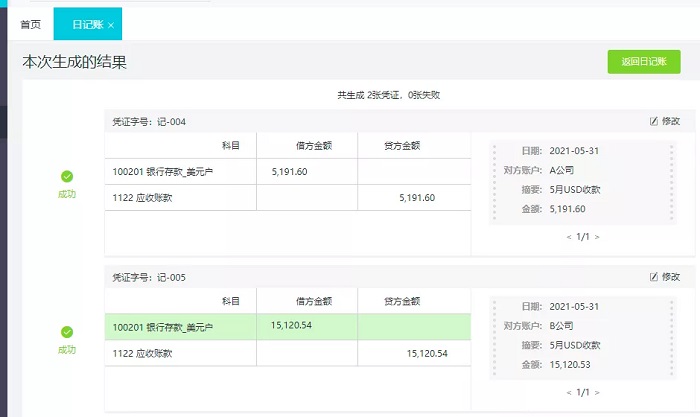 勾选需要生成凭证的流水,点击右上角生成凭证,再点击全部生成凭证,系统会根据“收支大类”和“收支类型”自动创建对应的凭证。