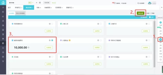 首月操作完成后,次月无需手工操作,只要点击【结账】—【期末结转】,点击【测算金额】-点击【生成凭证】,可查看生成的摊销凭证。