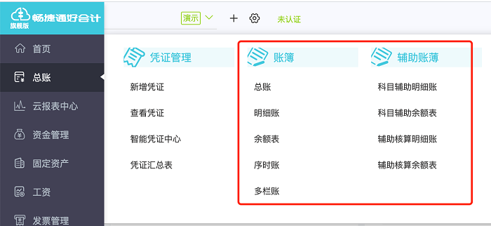 畅捷通好会计财务软件账簿功能模块主要有以下几个板块构成:总账、明细账、余额表、多栏账、辅助核算明细账、辅助核算余额表
