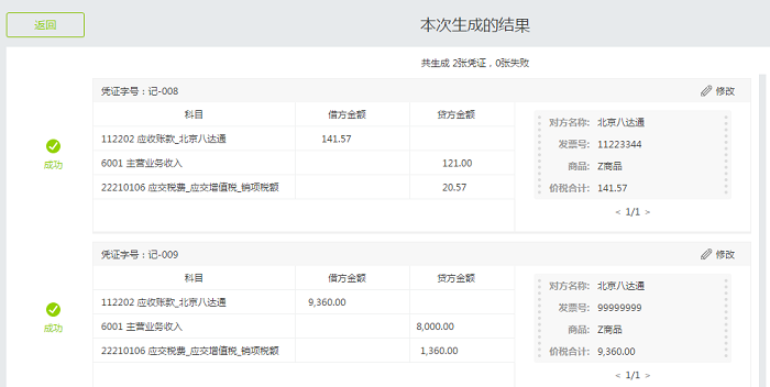 生成凭证结果界面与发票生成凭证界面类似,不再展示。