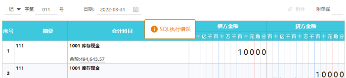 易代账中增加并保存凭证的时候提示【sql执行错误】。