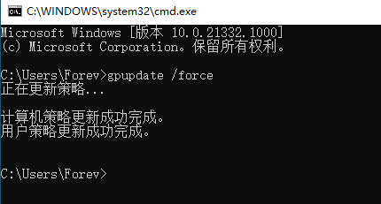 修改组策略之后需刷新组策略配置才生效,命令为:gpupdate /force