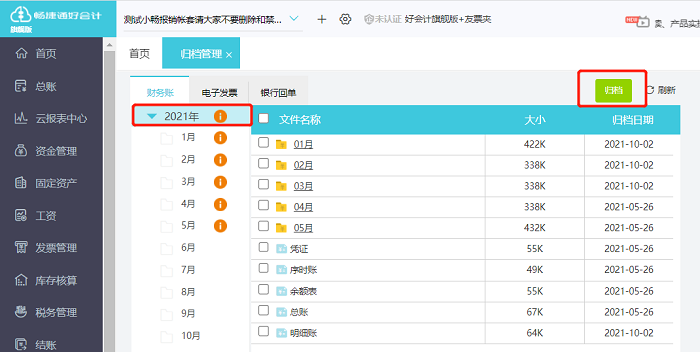 方法一:批量下载明细账,需要归档后才能下载,具体操作:依次点击【设置】-【归档管理】选择左侧的年份,例如我们需要下载2021年的,则点击【2021年】然后再点击右侧的【归档】