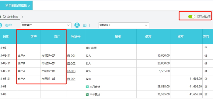 右上角显示辅助项打开可以看到每条明细账相应的辅助项,如下图: