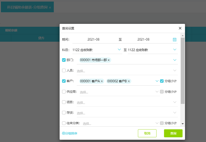 分组查询针对多辅助核算使用,例如需要查询市场一部下分别A和B客户的余额和汇总金额