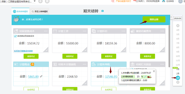 2、进结账-期末结转,点本期测算金额后,生成的计提所得税模板所列示金额如下: