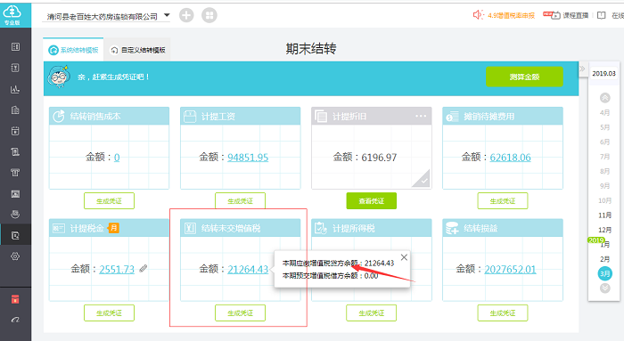 路径:进结账-期末结转,先点测算,完成后即可生成结转未交增值税分录
