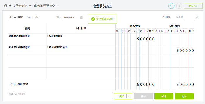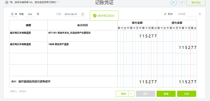 ①点完小扫帚图标完成台账清理后,系统会同步生成一条清理记录,选择其点生成凭证即可自动生成清理凭证(系统模板需要自己按截图设置修改下),剩余凭证需要手工录入