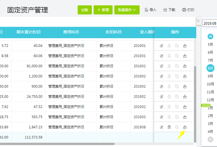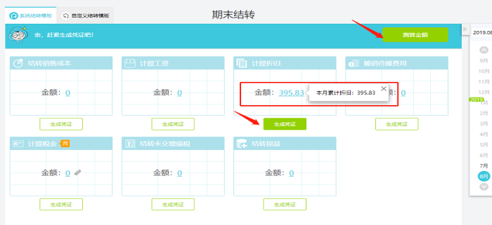 首先要做的是做一张计提折旧的凭证,该凭证可以手工新增,也可以在【结账-期末结转】中生成计提折旧的凭证,然后再到【固定资产管理】中,该固定资产录入期间后会出现一个小扫帚的图标,点击即可清理