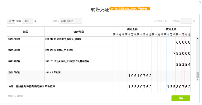 如果选择收入费用合并结转,即生成一张凭证如下: